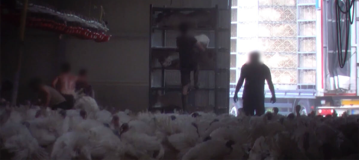 Beim Ausstallen in diesem Putenmastbetrieb gingen die Mitarbeitende grob mit den Tieren um. Unter Zeitdruck wurden die durch die schnelle Gewichtszunahme während der Mast beanspruchten Tiere verladen. Die Tiere wurden ohne Rücksicht auf Verletzungen in die Transportkäfige verbracht.